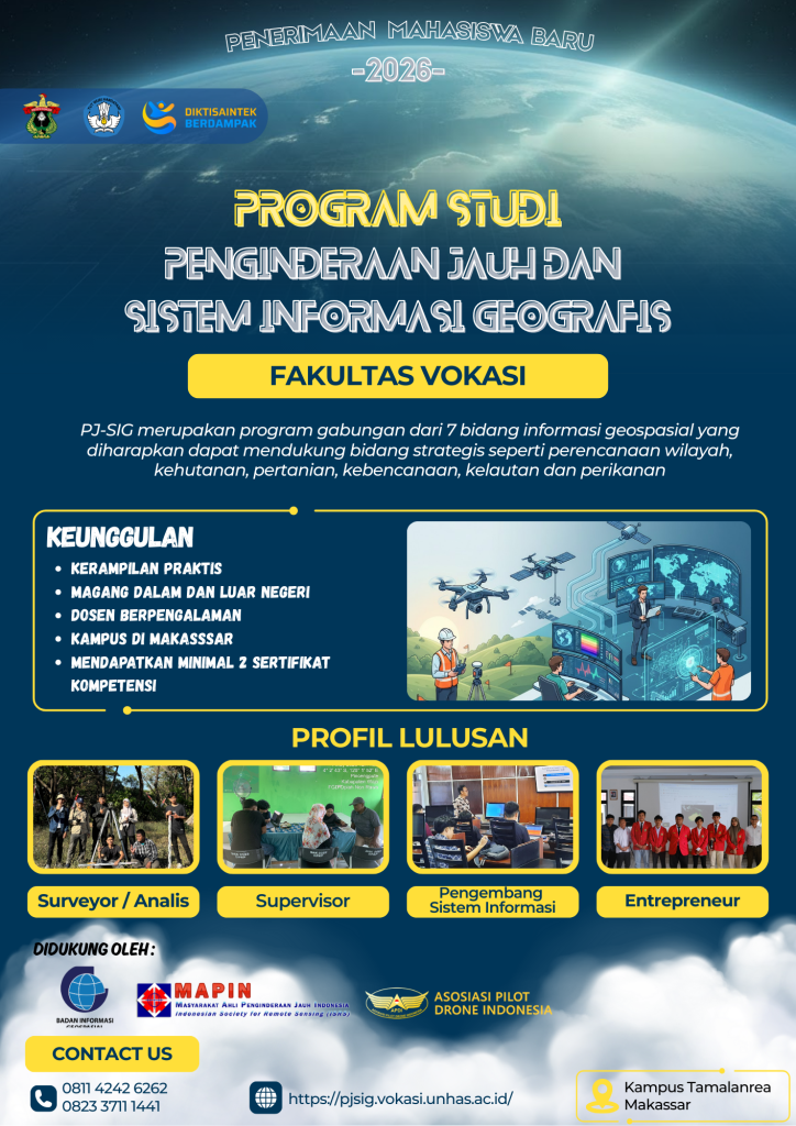 Selamat datang di laman Program Studi Penginderaan Jauh & Sistem Informasi Geografis Fakultas Vokasi Hasanuddin, Makassar. Laman ini berisi informasi tentang Program Studi Penginderaan Jauh & Sistem Informasi Geografis